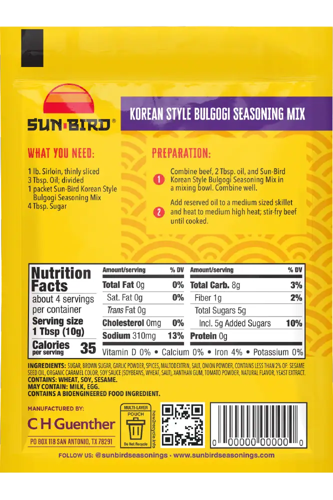 - 1 packet Sun-Bird® Korean Style Bulgogi Seasoning Mix